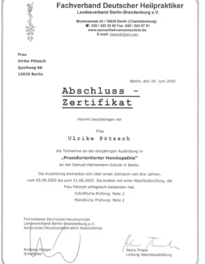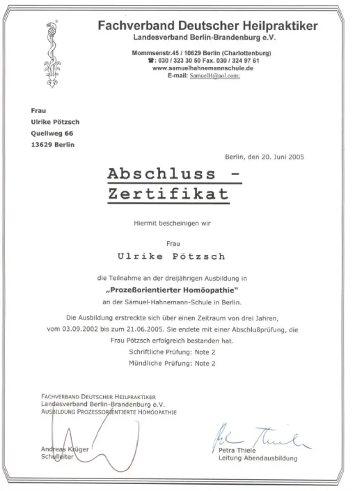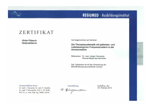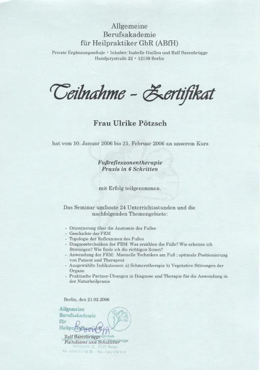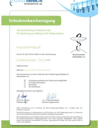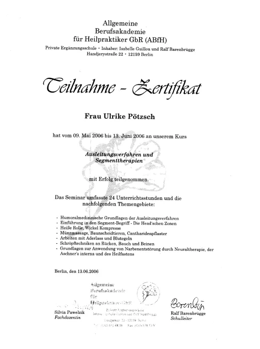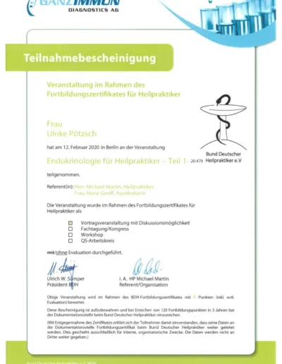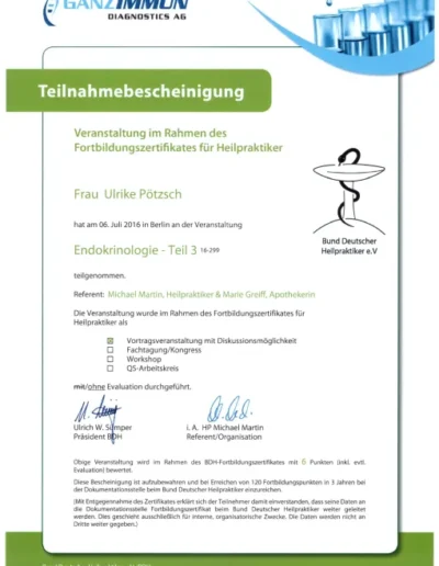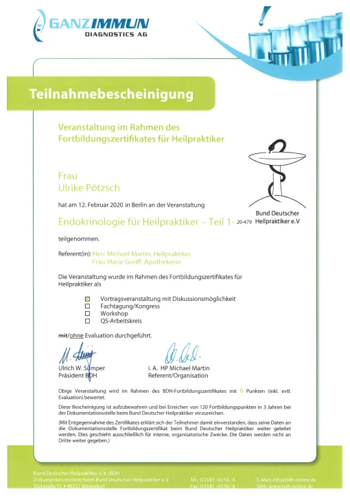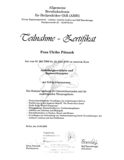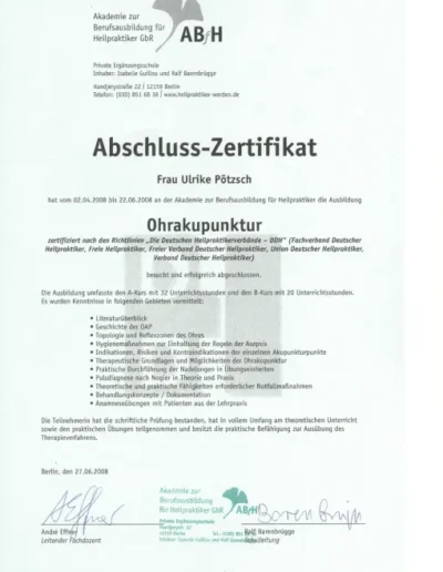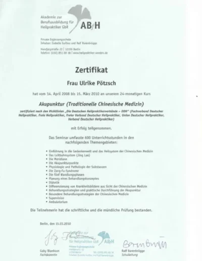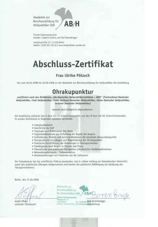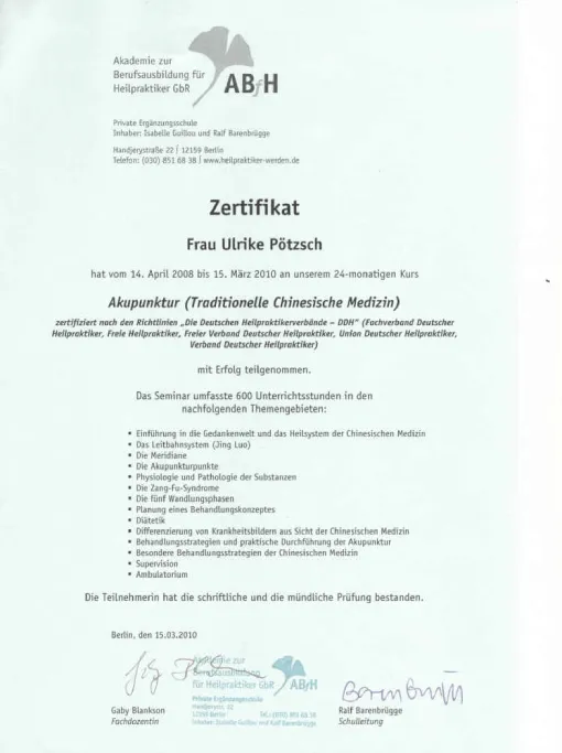 Auch in meinem Beruf sind Zertifizierungen wichtig, um qualitativ hochwertige Ausbildungen zu sichern. Die großen Heilpraktikerverbände haben deshalb Ausbildungsstandards festgelegt. Die Ausbildung in Akupunktur an der ABfH erfüllt diese Richtlinien und ist vom DDH (Dachverband der 5 größten deutschen Heilpraktikerverbände) zertifiziert worden.
